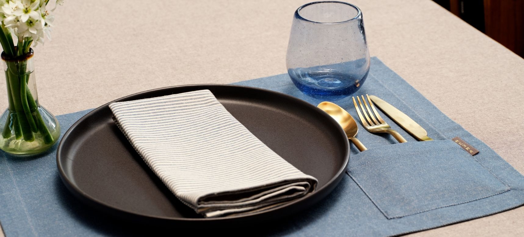 Our placemats come in two designs, both made from durable upcycled cotton and finished with our signature craftsmanship.