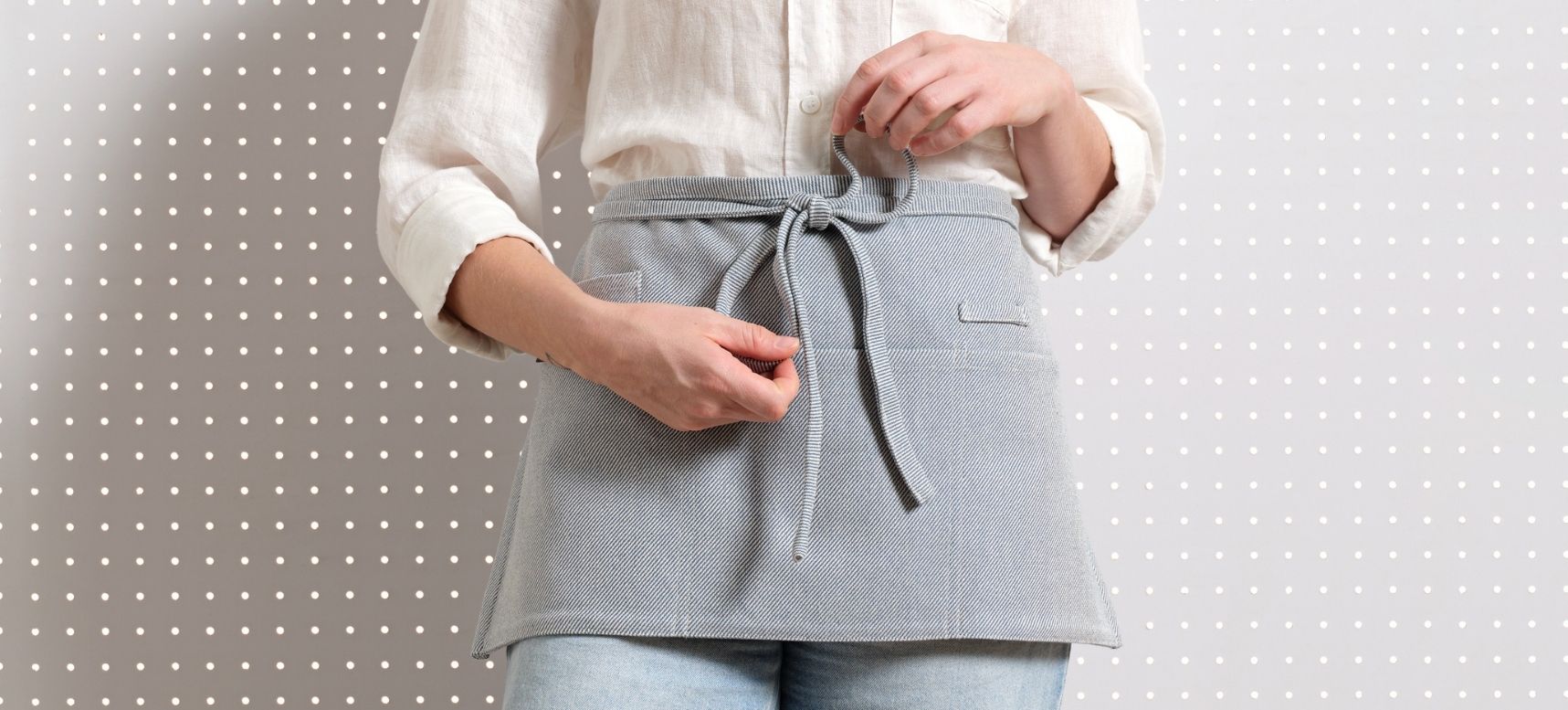 This is a short, practical apron that sits comfortably around the waist and allows full freedom of movement — ideal for people who move around a lot, whether in the kitchen, café, or workshop.